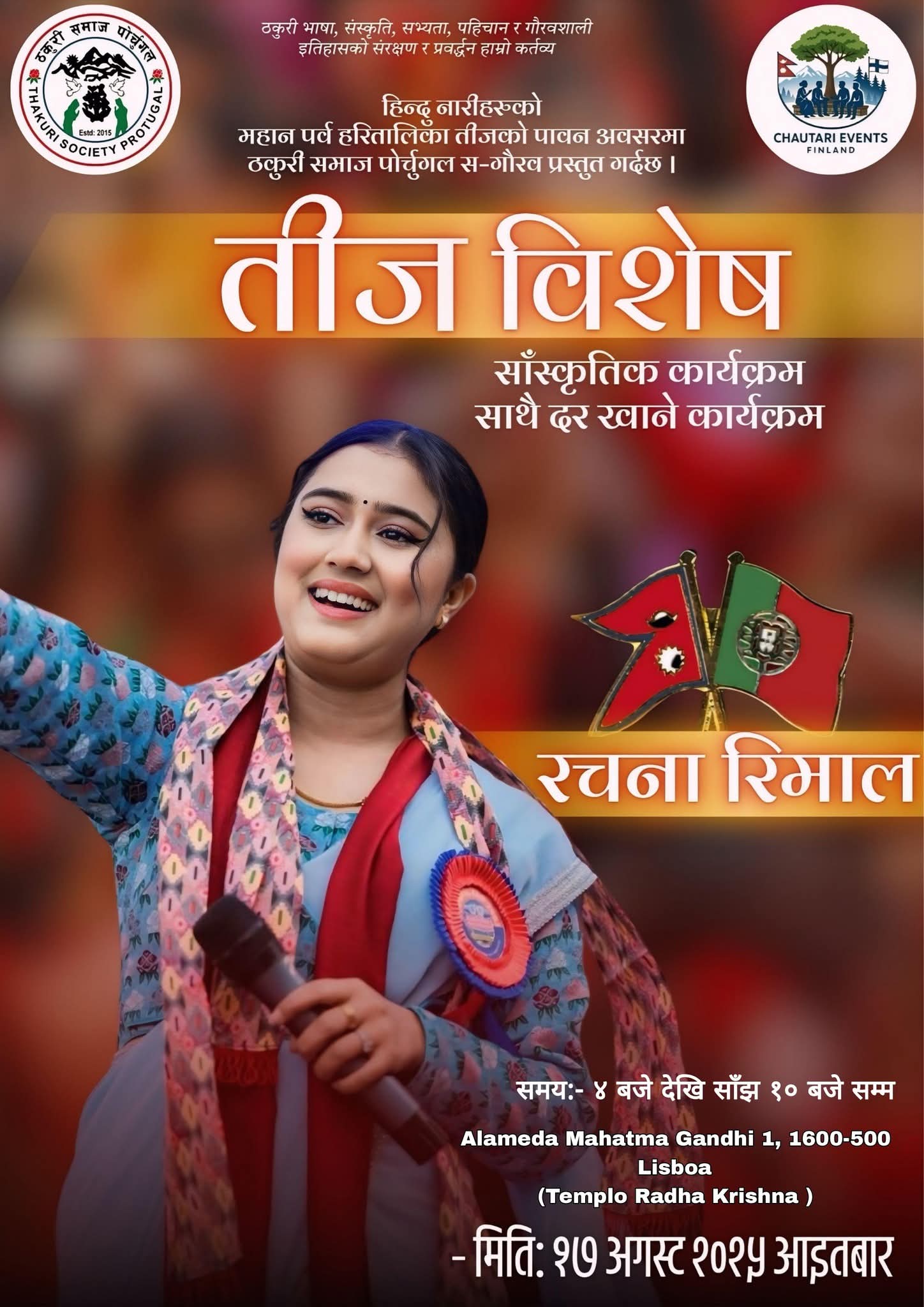 नेपाली कला, संस्कृति र परम्परालाई प्रवासमा समेत जीवन्त राख्ने उद्देश्यले आयोजना गर्न लागिएको यो कार्यक्रम आगामी अगस्ट १७ तारिख, आइतबारका दिन लिस्बनको अल्मेडास्थित महात्मा गान्धी राधा कृष्ण मन्दिरमा सम्पन्न हुनेछ ।