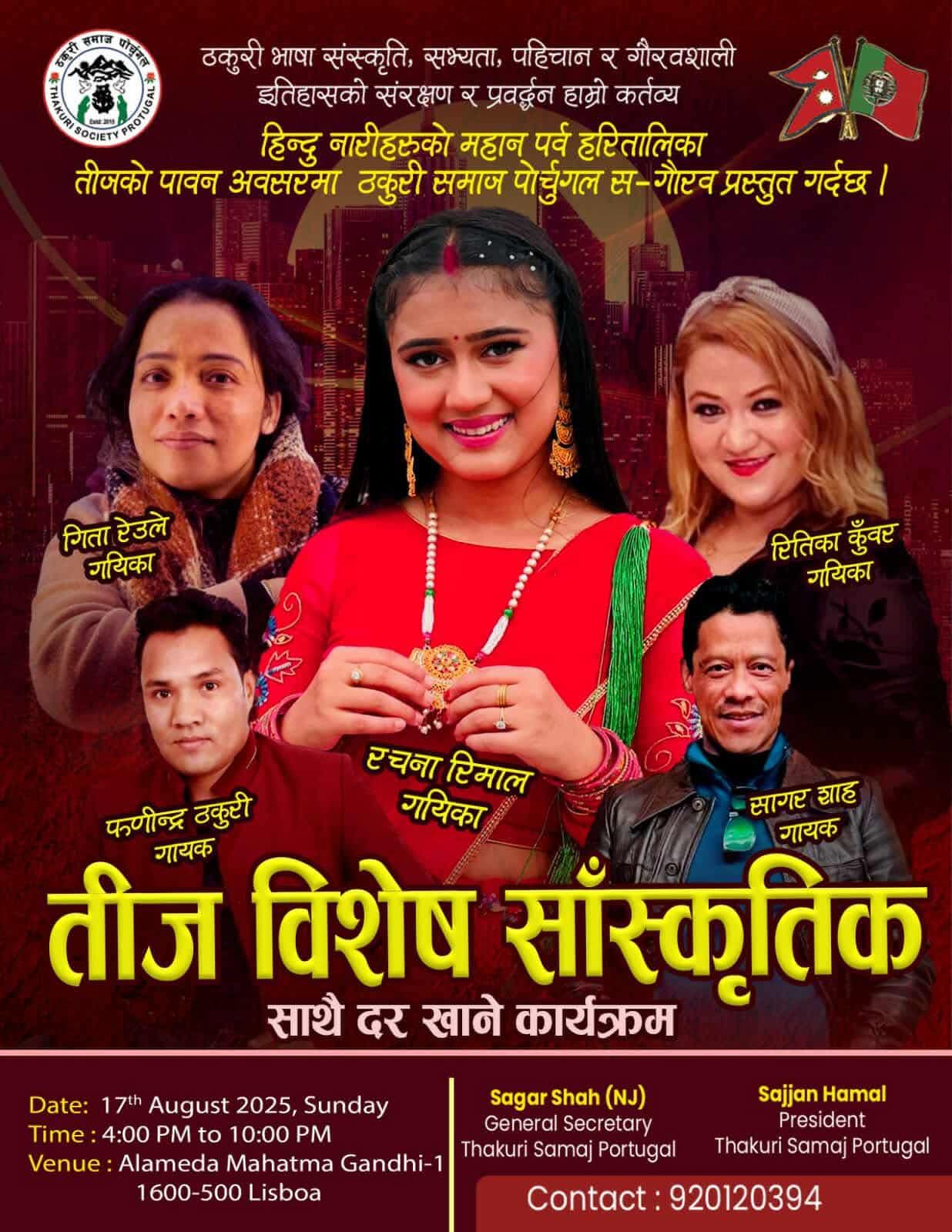 ठकुरी समाज पोर्चुगलले भब्यताकासाथ एक विशेष साँस्कृतिक तथा दर खाने कार्यक्रमको आयोजना गर्ने भएको छ । नेपाली नारीहरुको महान पर्व हरितालिका तीजको अवसरमा सो कार्यक्रम गर्न लागेको हो।