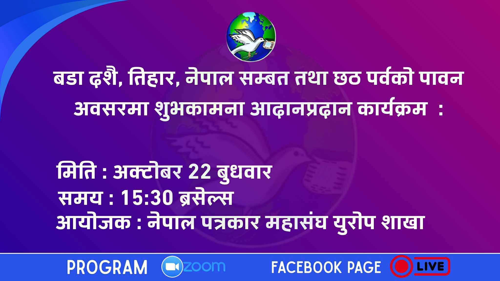 नेपाल पत्रकार महासंघ युरोप शाखाले शुभकामना आदानप्रदान कार्यक्रमको आयोजना गर्ने भएको छ।